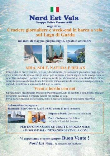 Nord Est Vela Sailing Team, organizza crociere giornaliere e week end in barca a vela sul lago di Garda per compleanni, addii al celibato o al nubilato, crociere per gruppi aziendali, crociere notturne con aperitivo a bordo. Concediti una pausa di puro relax e divertimento a bordo di una splendida imbarcazione da crociera dotata di tutti in confort. *Possibilità di pernottamento a bordo nella notte precedente la crociera. Porti disponibili per l’imbarco : Lazise, Garda, Bardolino, Torri del Benaco su richiesta si possono effettuare imbarchi in altri porti del lago di Garda Skipper a bordo, Hostess su richiesta Per informazioni su costi e programma : [email protected] per contatto diretto skipper: 348 8952464
