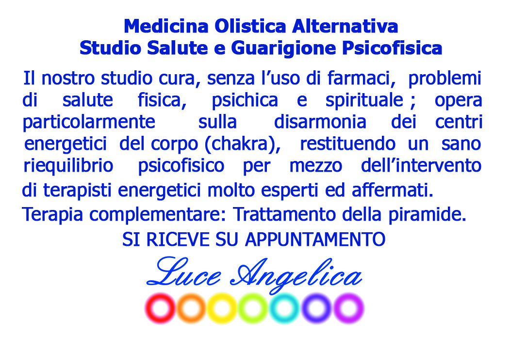 Il nostro studio cura, senza l’uso di farmaci, problemi di salute fisica, psichica e spirituale; opera particolarmente sulla disarmonia dei centri energetici del corpo (chakra), restituendo un sano riequilibrio psicofisico per mezzo dell’intervento di terapisti energetici molto esperti ed affermati.